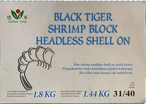 [81065] GC 31/40 黑虎大虾 (无头有壳) 1.8kg (净重 1.44kg) | GC Brand Black Tiger Shrimps 31/40 HLSO 1.8kg (1.44kg)